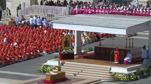 En la homilía el cardenal Giovanni Battista Re, decano del Colegio Cardenalicio, agradeció la presencia de los Jefes de Estado, Jefes de Gobierno y Delegaciones oficiales venidas para expresar afecto y estima hacia el Pontífice. “Te pedimos que reces por nosotros y que desde el cielo bendigas a la Iglesia”. “Nadie se salva solo”.