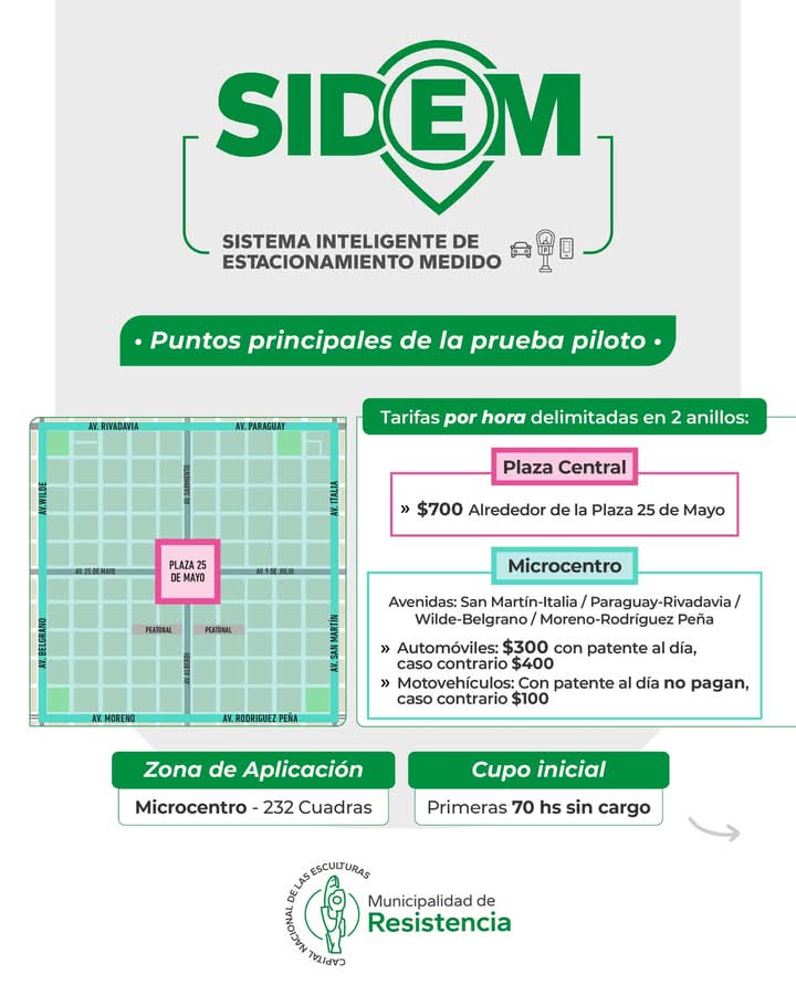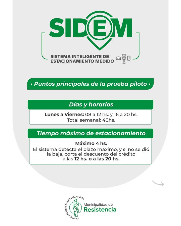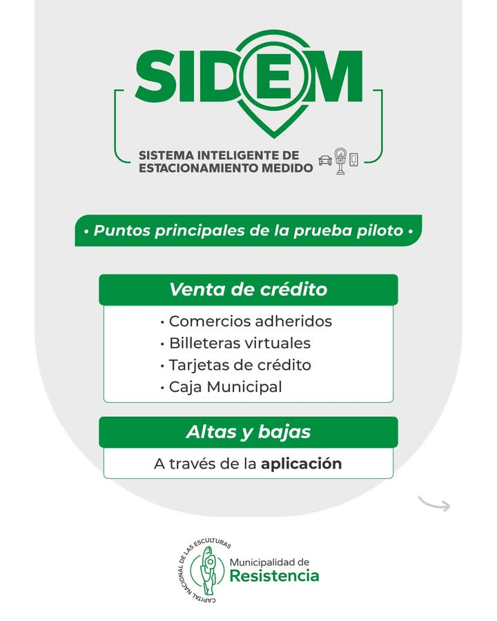 Se podrá descargar la aplicación del SIDEM para la habilitación del estacionamiento, o hacerla en comercios, billeteras virtuales, Caja Municipal de Resistencia y/o tarjetas de crédito, mientras que se trabaja en un convenio con Lotería Chaqueña.
