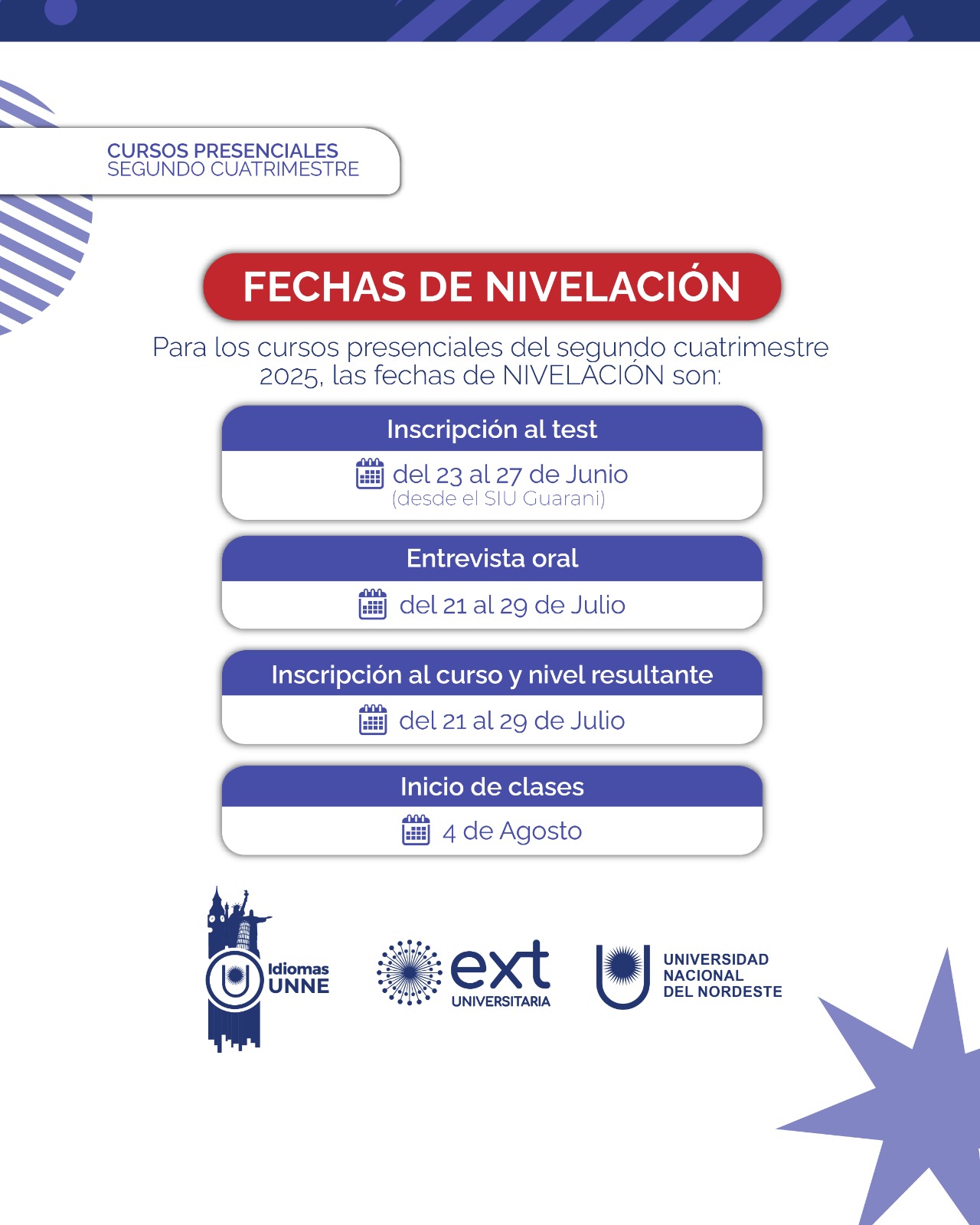 Este período arranca el 23 de junio para el segundo cuatrimestre del ciclo lectivo 2025. Por eso, desde Idiomas UNNE remarcaron la importancia de explicar y destacar en qué consiste la Nivelación. Cuenta con cuatro momentos simples de autoevaluación y evaluación: primero la inscripción para un test online. Luego, el desarrollo de este *test online* a modo de autoevaluación: una vez que la persona se inscribe , desde el Departamento de Idiomas se manda al correo un formulario Google con preguntas que permiten al docente saber el nivel de conocimiento del idioma del alumno. En tercer lugar, luego de hacer el test, hay una entrevista oral particular: el docente coordina una cita a una fecha y hora para determinar y comunicar el nivel al que el alumno puede anotarse . Finalmente, se hacen las inscripciones al curso y nivel que más se adecue según los conocimientos de cada estudiante.