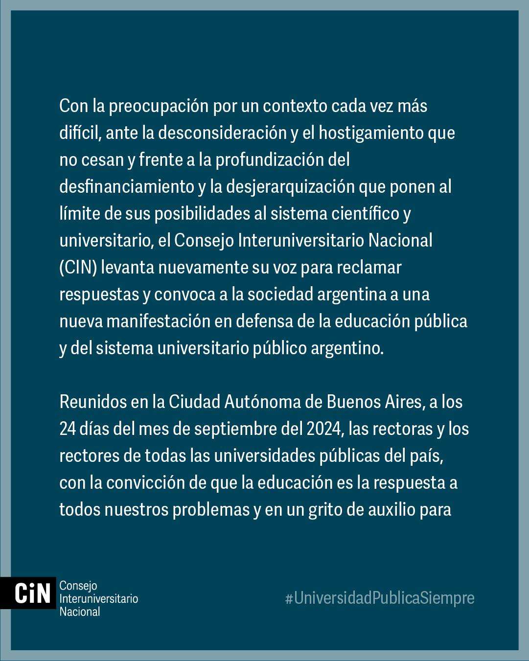 Allí se expone que con la preocupación por un contexto cada vez más difícil, ante la desconsideración y el hostigamiento que no cesan y frente a la profundización del desfinanciamiento y la desjerarquización que ponen al límite de sus posibilidades al sistema científico y universitario, “el Consejo Interuniversitario Nacional (CIN) levanta nuevamente su voz para reclamar respuestas y convoca a la sociedad argentina a una nueva manifestación en defensa de la educación pública y del sistema universitario público argentino”.