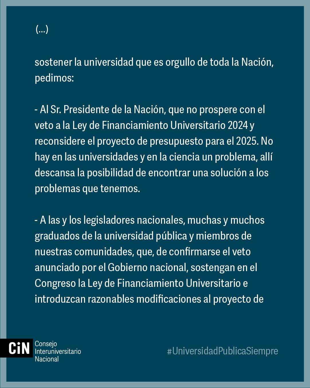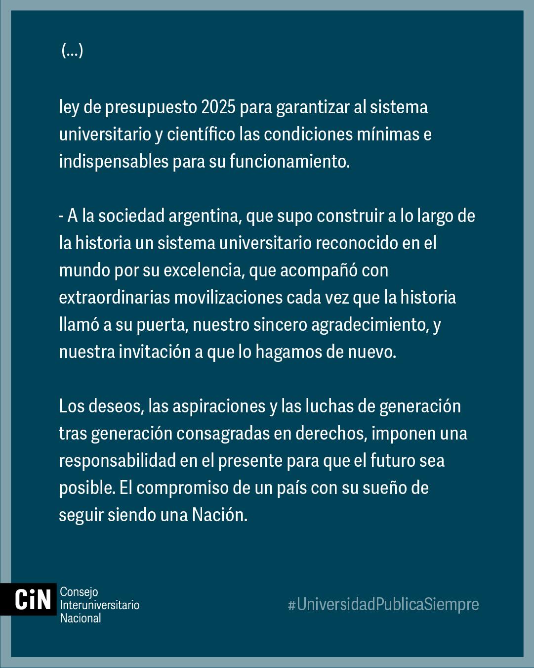 “A la sociedad argentina, que supo construir a lo largo de la historia un sistema universitario reconocido en el mundo por su excelencia, que acompañó con extraordinarias movilizaciones cada vez que la historia llamó a su puerta, nuestro sincero agradecimiento, y nuestra invitación a que lo hagamos de nuevo”, remarca en su parte final el comunicado del CIN.