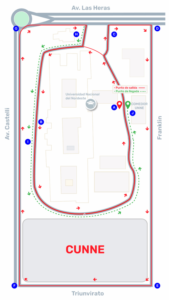 El circuito contempla la salida desde el Comedor del Campus, recorrido interno y luego calles externas como Avenida Las Heras, Franklin, Triunvirato y Castelli, para finalmente ingresar nuevamente al predio universitario y culminar en el punto de inicio.