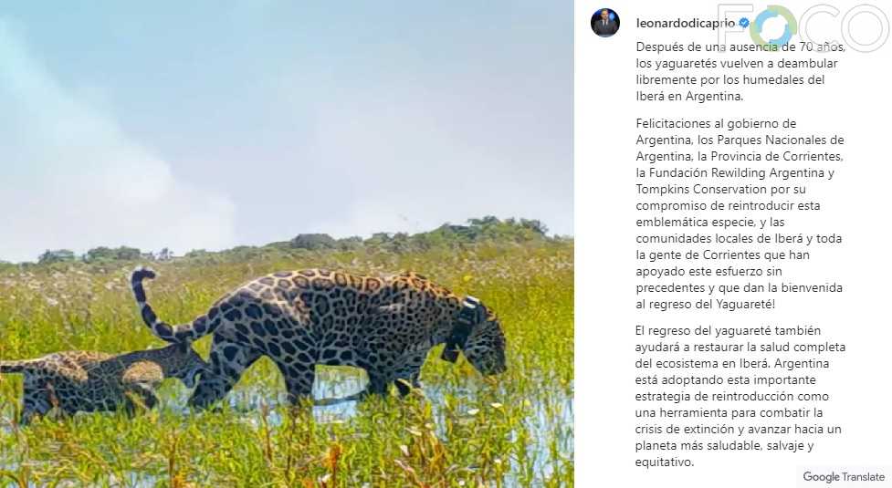 “Después de una ausencia de 70 años, los yaguaretés vuelven a deambular libremente por los humedales del Iberá en Argentina”, celebró quien fuera premiado con un Oscar en 2015 como Mejor Actor por su rol en la película El Renacido.