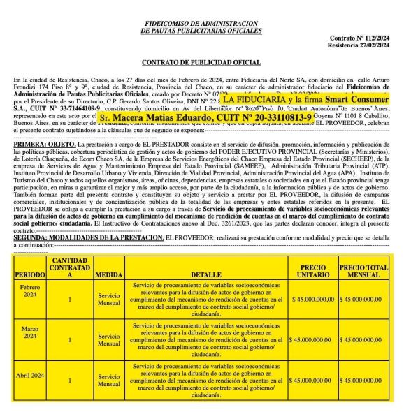“A diferencia de otras provincias, que cumplen con el requisito de publicación en los boletines oficiales, en el Chaco, existirían referencias sobre que el Secretario de Coordinación Estratégica habría dispuesto de más de $ 2.625 millones en tan sólo 14 meses, en contratos que van desde los ocho hasta los $ 45 millones por mes), a espaldas del pueblo Chaqueño” manifestó el legislador.