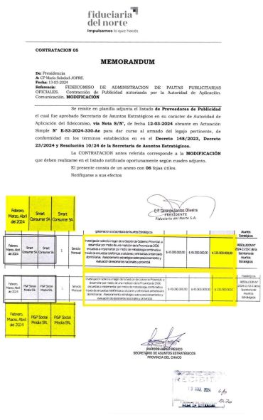 Slimel, expresó que “resulta particularmente alarmante el involucramiento de ciertas firmas contratadas por el FAPPO, tales como: P&P Social Media SRL (CUIT 30-71432909-6), ADYOUWISH SRL (CUIT 30-71447453-3), SMART DATA SAS (CUIT 30-71608566-6) y SMART CONSUMER SA (CUIT 33-71464109-9)”.